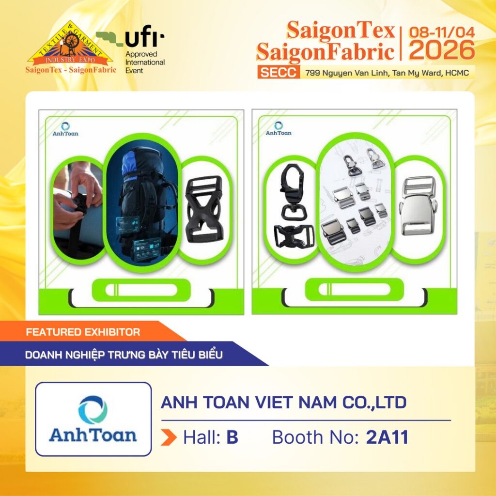 Tại Triển lãm Quốc Tế ngành Công nghiệp Dệt & May, Thiết bị nguyên phụ liệu & vải – SAIGONTEX – SAIGONFABRIC 2026, CÔNG TY TNHH ANH TOÀN VIỆT NAM sẽ giới thiệu các sản phẩm phụ liệu nhựa và linh kiện kỹ thuật, đáp ứng nhu cầu đa dạng của ngành may mặc, giày dép và các lĩnh vực sản xuất liên quan.