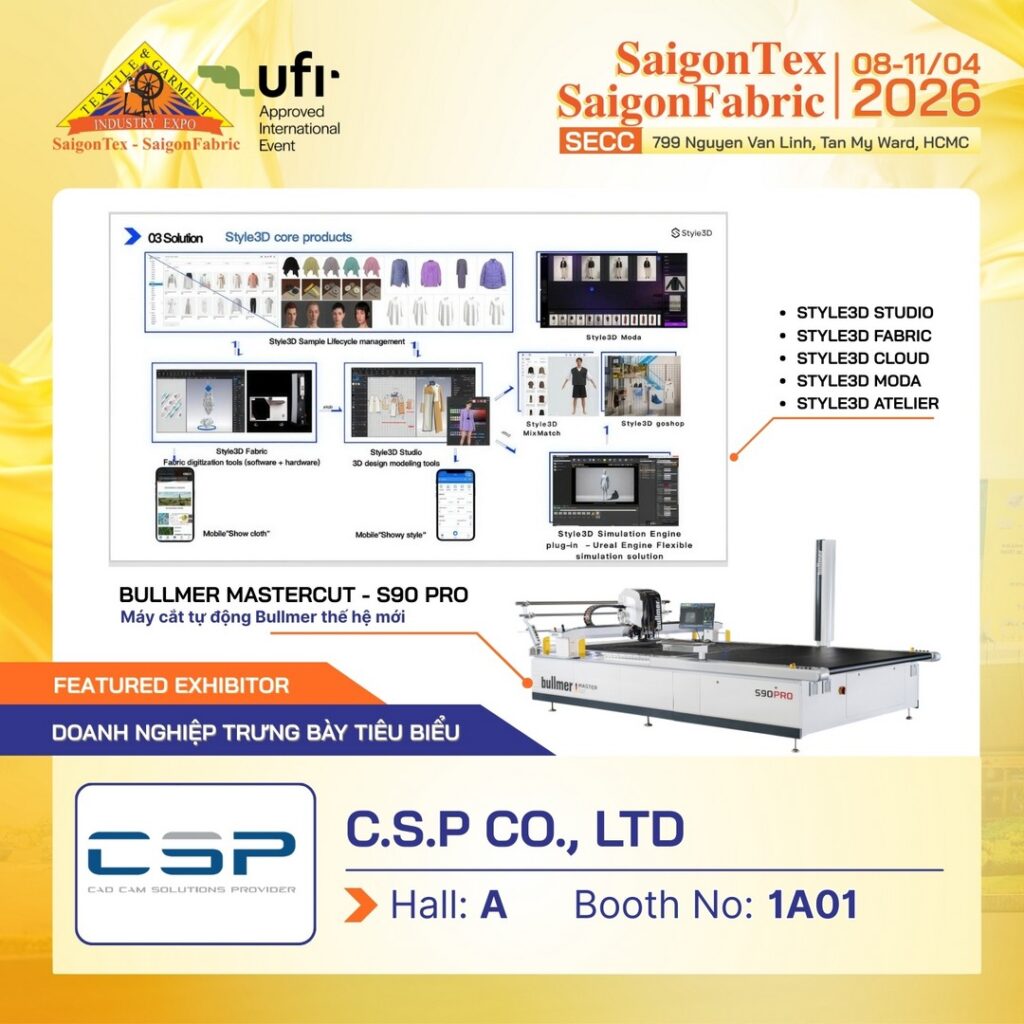 Tại Triển lãm Quốc Tế ngành Công nghiệp Dệt & May, Thiết bị nguyên phụ liệu & vải – SAIGONTEX – SAIGONFABRIC 2026, C.S.P CO., LTD sẽ giới thiệu hệ sinh thái giải pháp thiết kế và sản xuất hiện đại dành cho ngành may mặc.