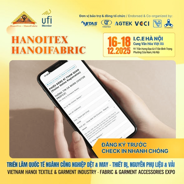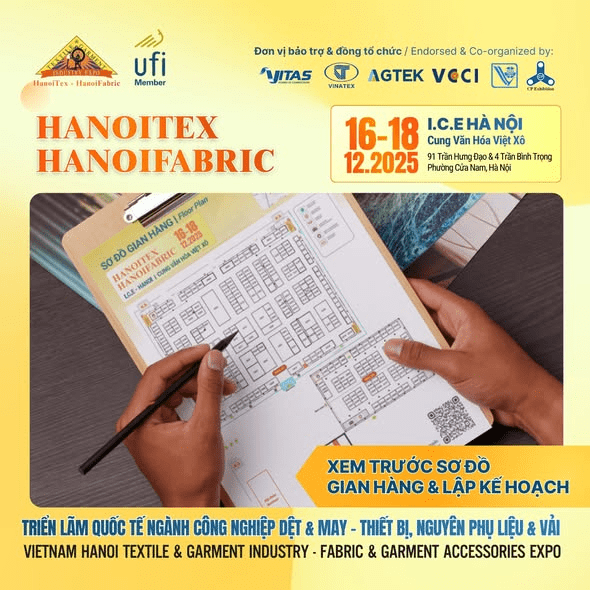 Triển lãm Quốc tế Ngành Công nghiệp Dệt May – Thiết bị, Nguyên phụ liệu & Vải HanoiTex & HanoiFabric 2025 sẽ chính thức diễn ra chỉ sau 3 ngày nữa, từ 16 – 18/12/2025 tại I.C.E Hà Nội – Cung Văn hóa Hữu nghị, địa chỉ 91 Trần Hưng Đạo / 4 Trần Bình Trọng, Phường Cửa Nam, Hà Nội.