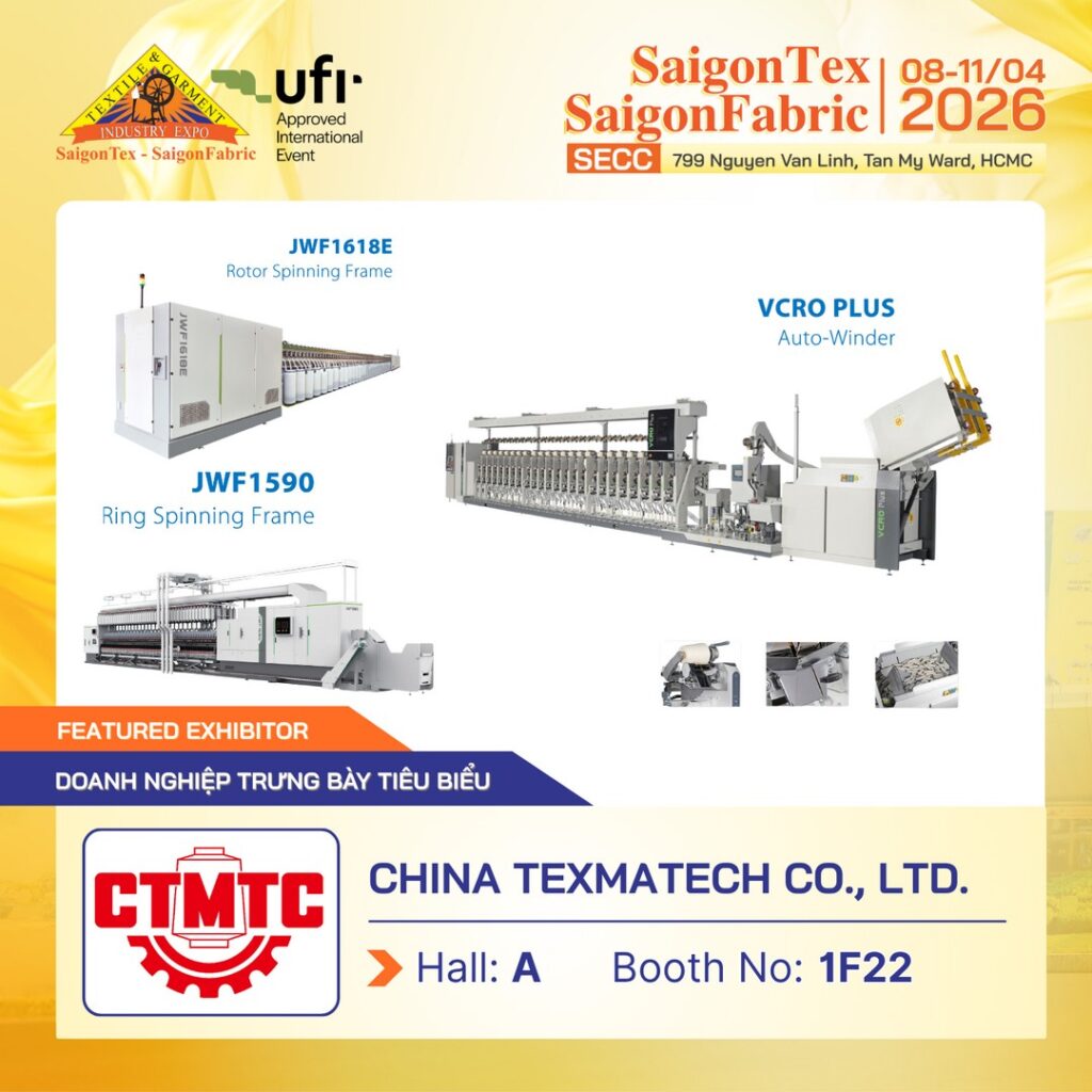 👉 Hãy đăng ký tham quan Triển lãm Dệt May Quốc Tế quy mô hàng đầu – SAIGONTEX – SAIGONFABRIC 2026 để gặp gỡ trực tiếp CTMTC và khám phá các giải pháp công nghệ kéo sợi tiên tiến.