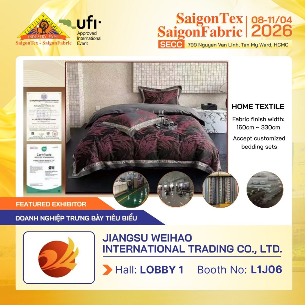 Tại Triển lãm Quốc Tế ngành Công nghiệp Dệt & May, Thiết bị nguyên phụ liệu & vải – SAIGONTEX – SAIGONFABRIC 2026, JIANGSU WEIHAO INTERNATIONAL TRADING CO., LTD. giới thiệu các dòng vải dệt may gia dụng chất lượng cao, đáp ứng nhu cầu sản xuất chăn ga gối và nội thất textile.