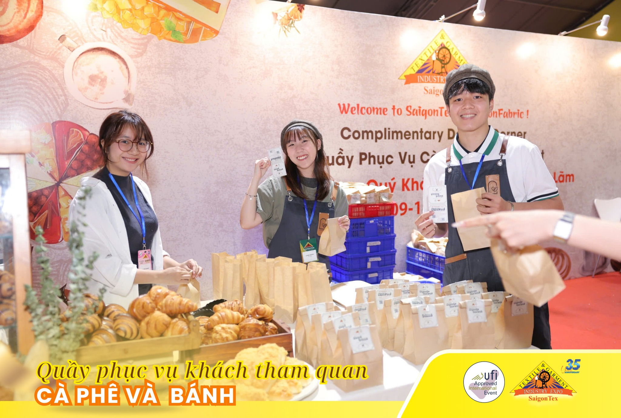 Miễn phí bánh ngọt và cà phê cho khách tham quan, tạo nên một không gian thư giãn và tiếp đón ấm áp trước khi bắt đầu các hoạt động tại triển lãm.