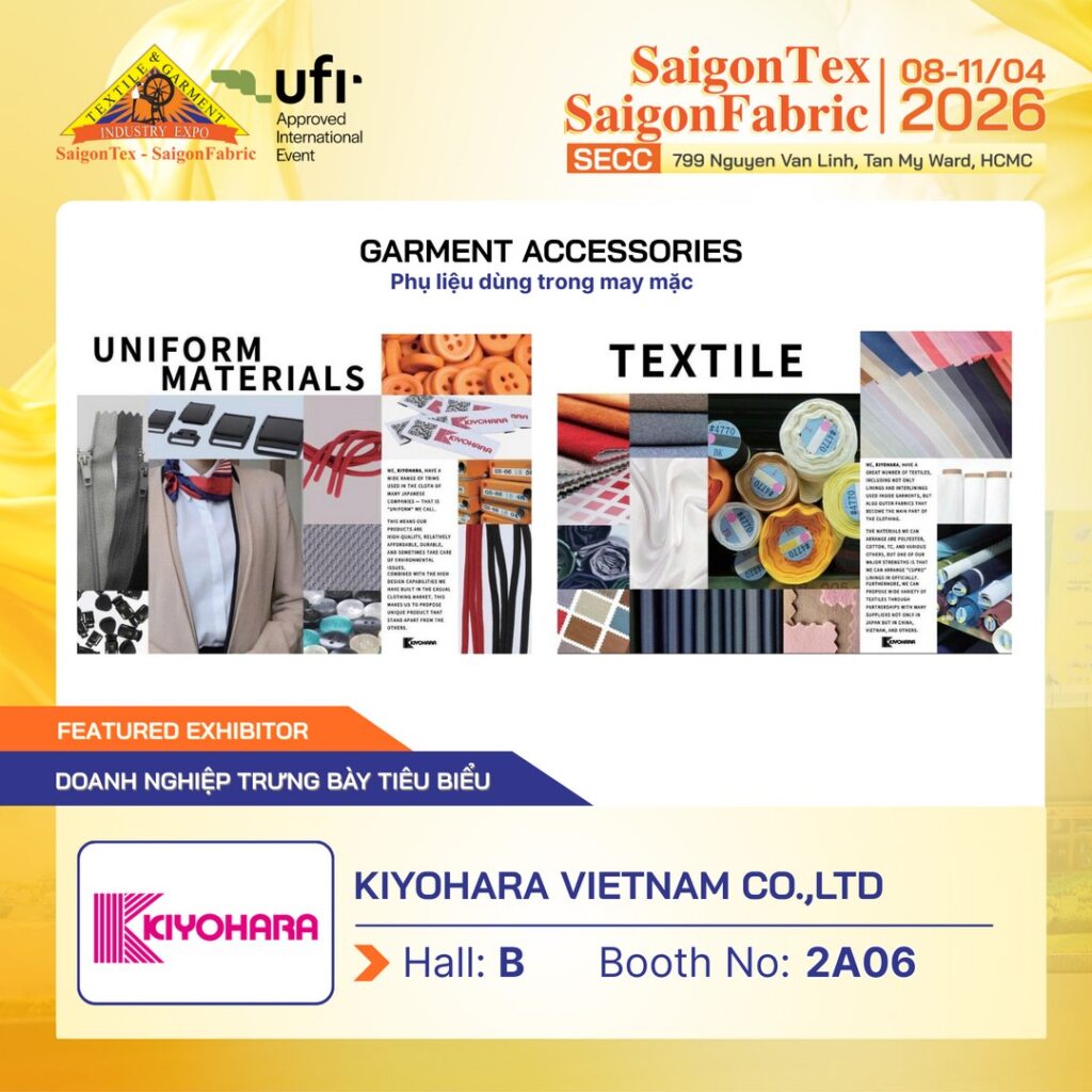 Tại Triển lãm Quốc tế ngành Công nghiệp Dệt & May, Thiết bị, Nguyên phụ liệu & Vải – SAIGONTEX – SAIGONFABRIC 2026, Kiyohara Vietnam Co., Ltd giới thiệu các sản phẩm phụ liệu phục vụ ngành may mặc.