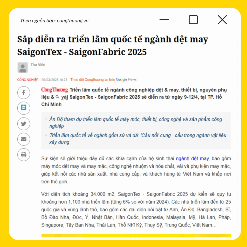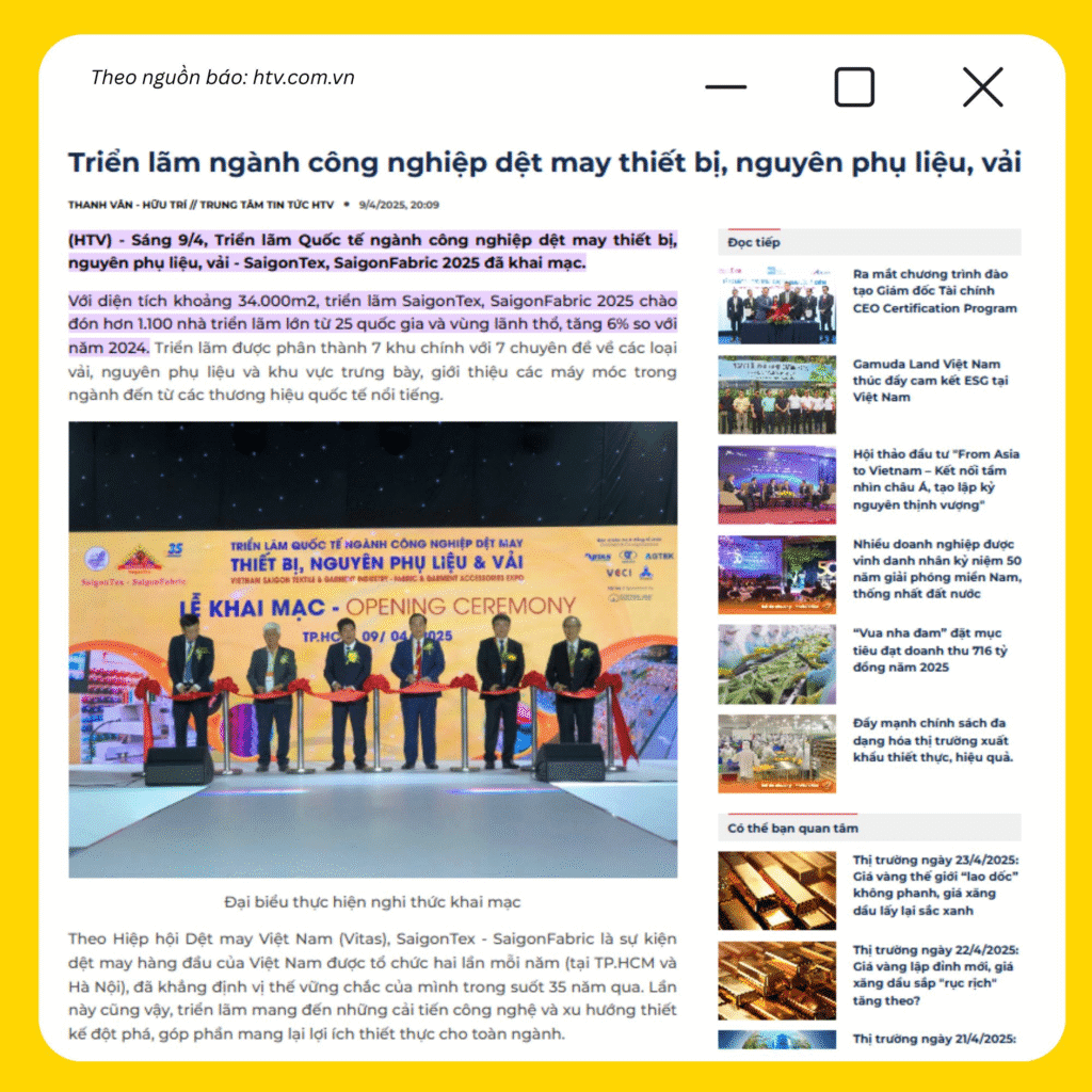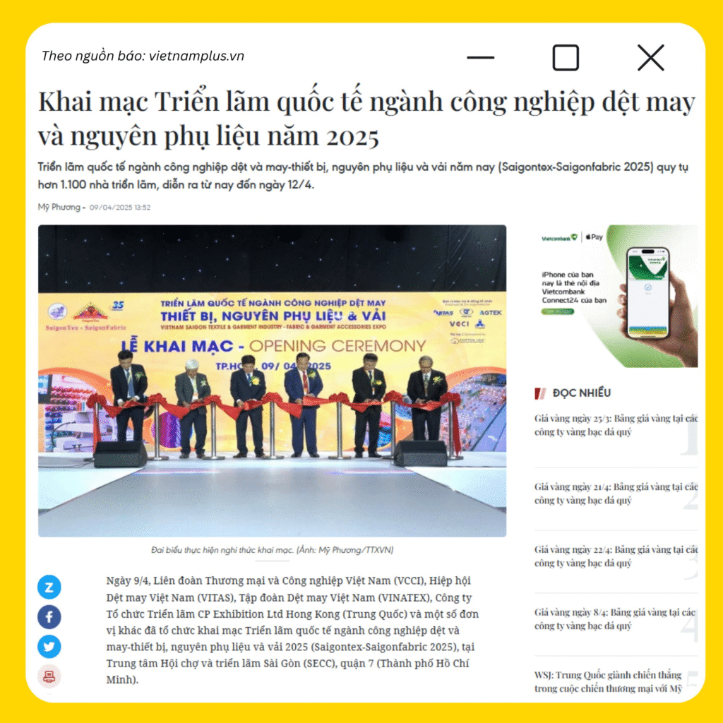 Triển lãm Quốc tế Ngành Công nghiệp Dệt & May – Thiết Bị, Nguyên Phụ Liệu & Vải 2025 (SaigonTex & SaigonFabric 2025) đã khép lại thành công tốt đẹp sau nhiều ngày diễn ra sôi nổi tại Trung tâm Triển lãm SECC, TP. Hồ Chí Minh. Sự kiện quy tụ hàng trăm doanh nghiệp trưng bày và hàng nghìn khách tham quan, mang đến không gian kết nối thương mại, giới thiệu công nghệ mới và cập nhật xu hướng phát triển của ngành dệt may Việt Nam và thế giới.