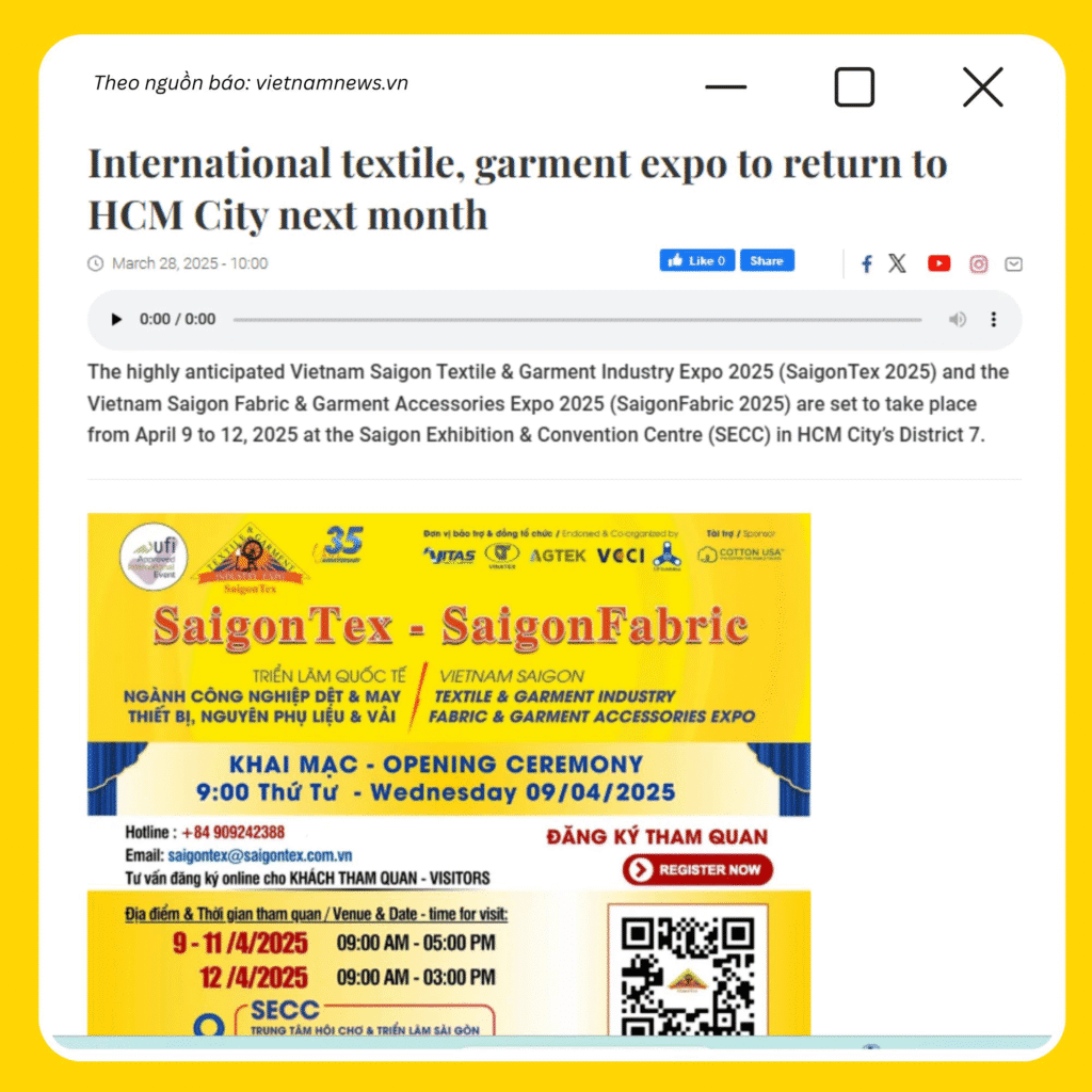 • SaigonTex & SaigonFabric 2026 | 08 – 11/04/2026 | Trung tâm Triển lãm SECC, Quận 7, TP.HCM