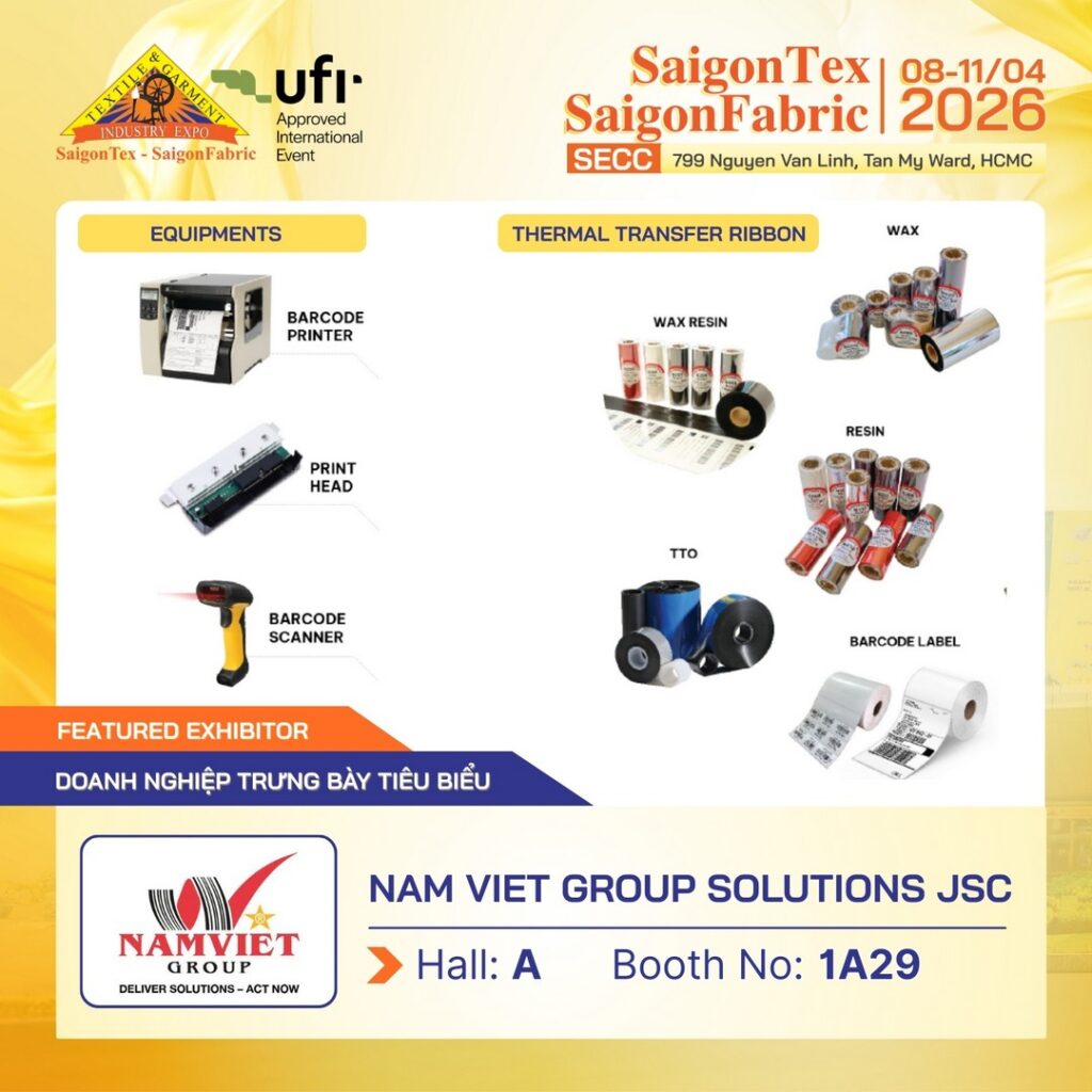 Tại Triển lãm Quốc Tế ngành Công nghiệp Dệt & May, Thiết bị nguyên phụ liệu & vải – SAIGONTEX – SAIGONFABRIC 2026, NAM VIET GROUP SOLUTIONS JSC sẽ giới thiệu các giải pháp in mã vạch và quản lý tem nhãn hiện đại, đáp ứng nhu cầu truy xuất và quản lý sản xuất trong ngành may mặc.