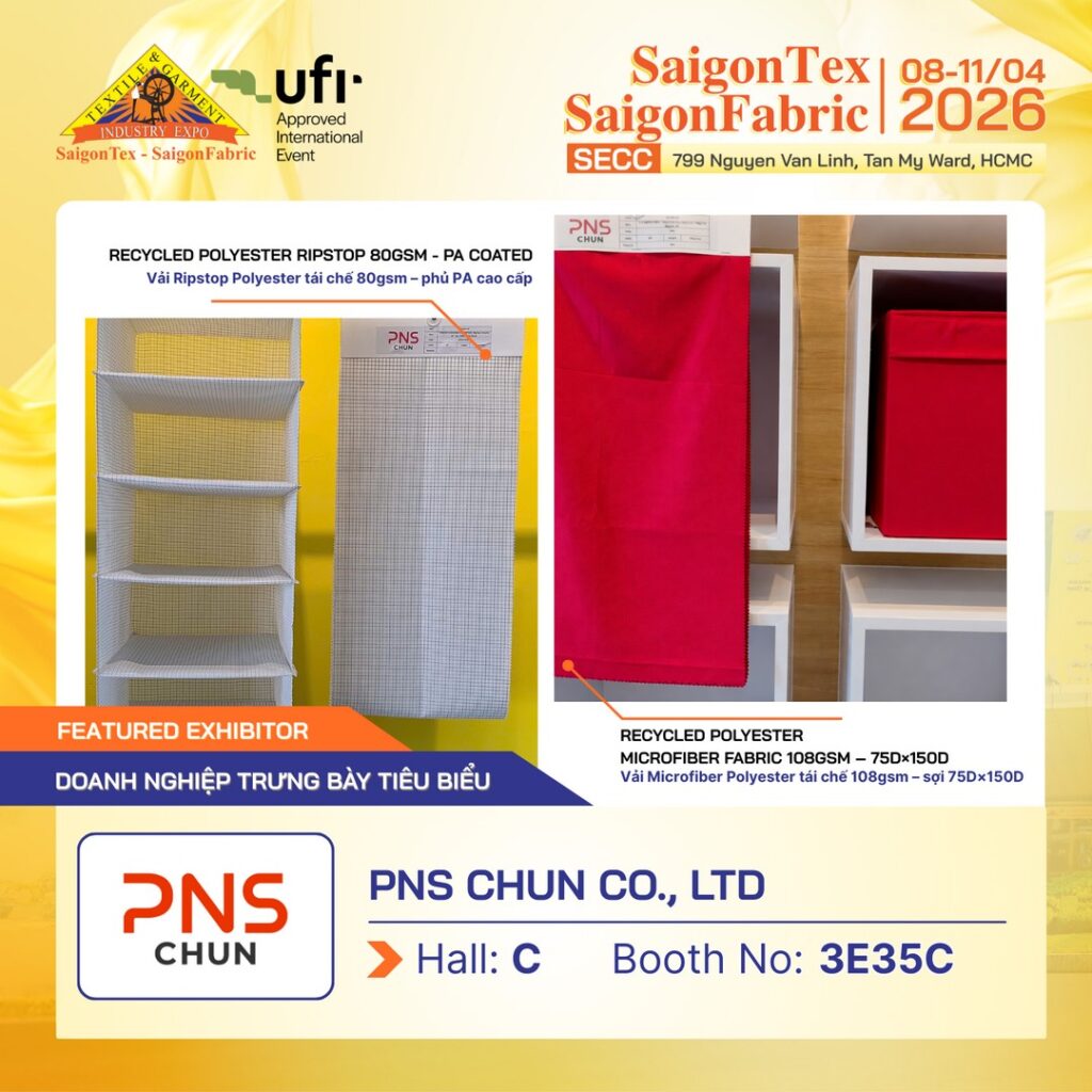 👉 Hãy đăng ký tham quan Triển lãm Dệt May Quốc Tế quy mô hàng đầu – SAIGONTEX – SAIGONFABRIC 2026 để gặp gỡ trực tiếp PNS CHUN và khám phá các giải pháp vải tái chế & tối ưu chi phí cho doanh nghiệp của bạn.