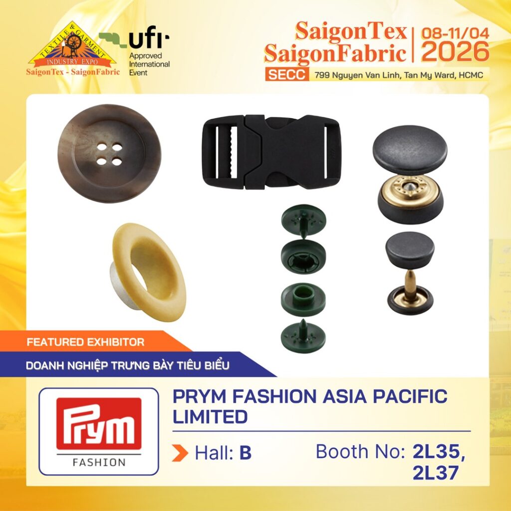 Tại Triển lãm Quốc Tế ngành Công nghiệp Dệt & May, Thiết bị nguyên phụ liệu & vải – SAIGONTEX – SAIGONFABRIC 2026, PRYM FASHION ASIA PACIFIC LIMITED giới thiệu các giải pháp phụ kiện khóa cài và chi tiết thời trang cao cấp, đáp ứng nhu cầu của ngành may mặc hiện đại.