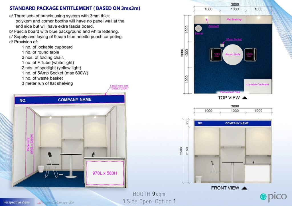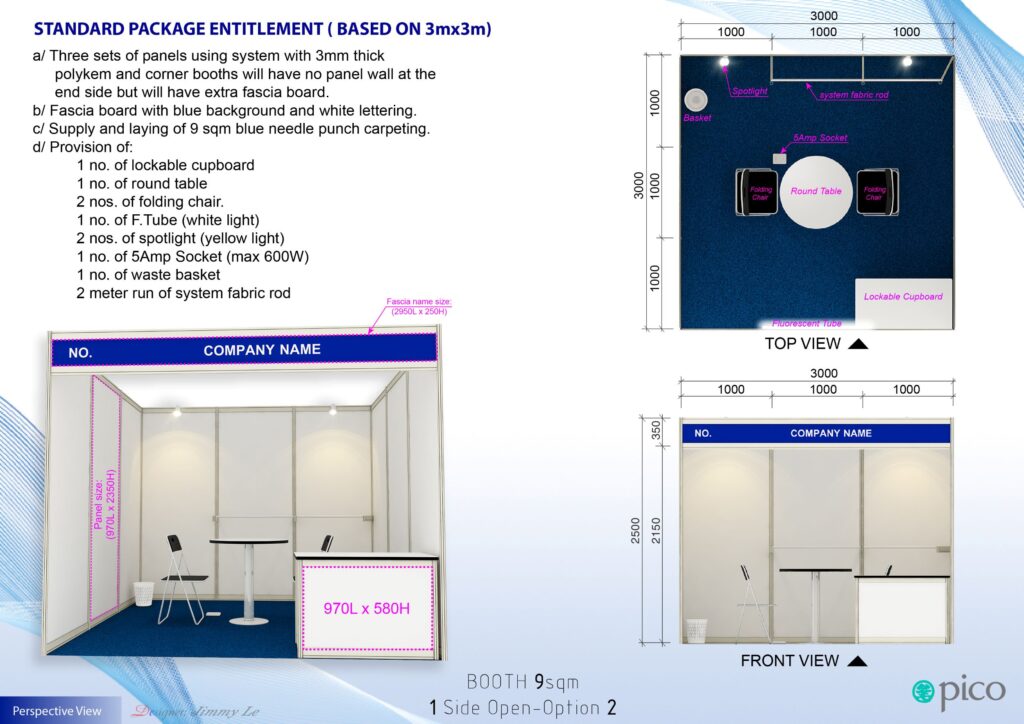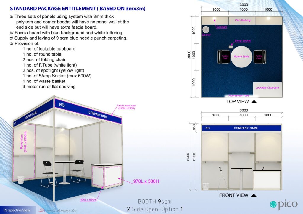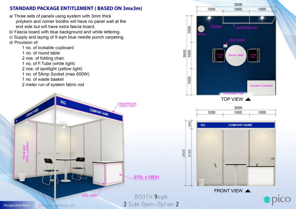 - Đối với gian hàng góc, sẽ không có vách ngăn ở phía bên cạnh, nhưng sẽ được bổ sung bảng tên (fascia board) ở mặt bên.