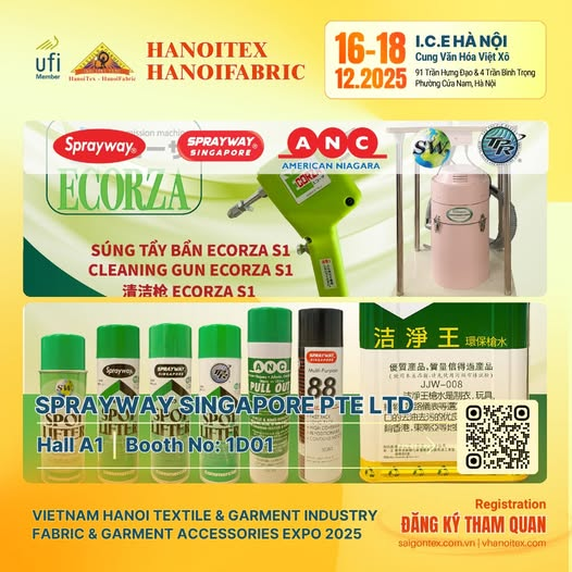 Mời Quý khách ghé thăm gian hàng Sprayway để tìm hiểu thêm về các giải pháp phụ liệu và thiết bị tiên tiến phục vụ sản xuất dệt may.