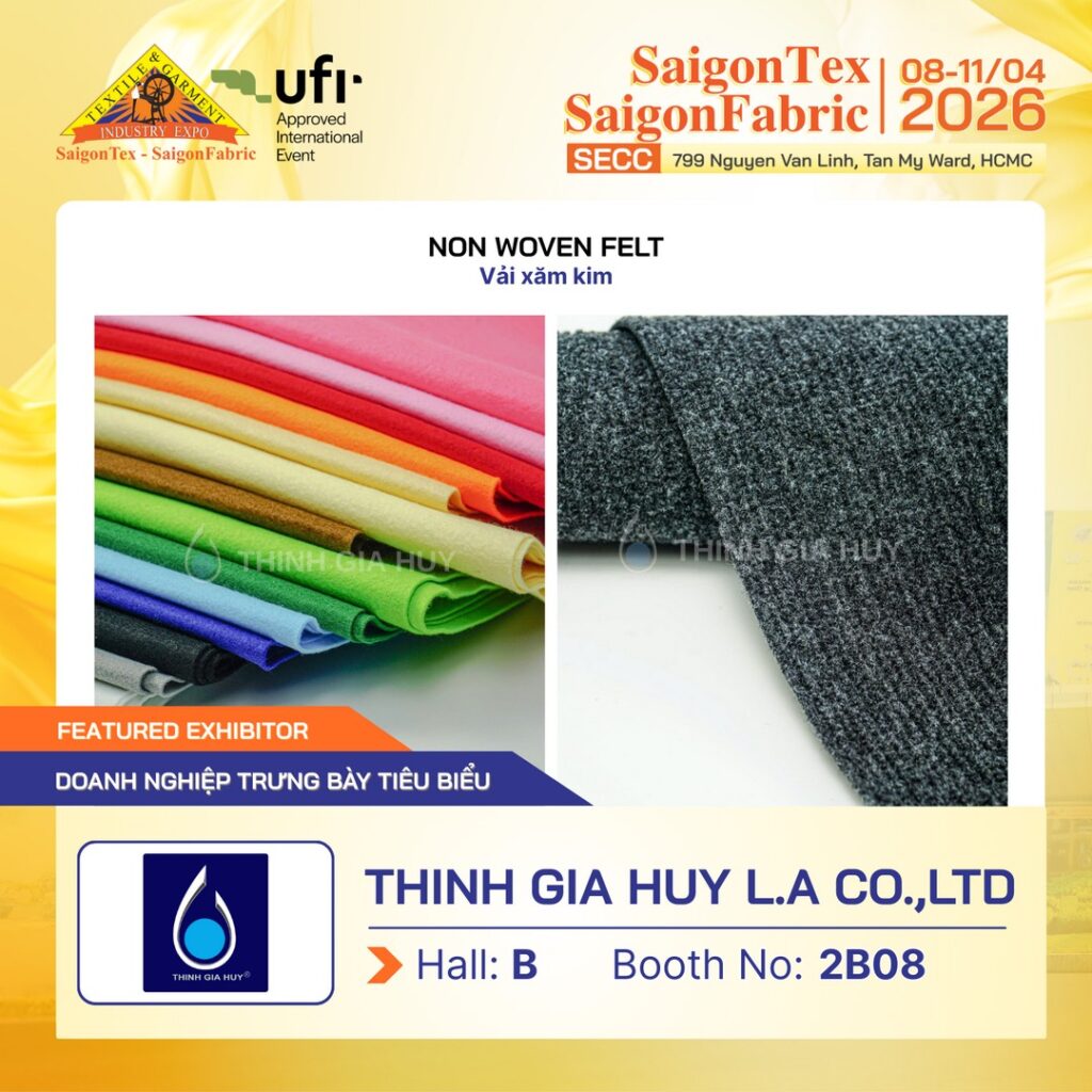 Tại Triển lãm Quốc Tế ngành Công nghiệp Dệt & May, Thiết bị nguyên phụ liệu & vải – SAIGONTEX – SAIGONFABRIC 2026, THINH GIA HUY L.A CO., LTD giới thiệu các dòng vải xăm kim (Non-woven felt) với đa dạng màu sắc và ứng dụng, đáp ứng nhu cầu của nhiều lĩnh vực sản xuất.