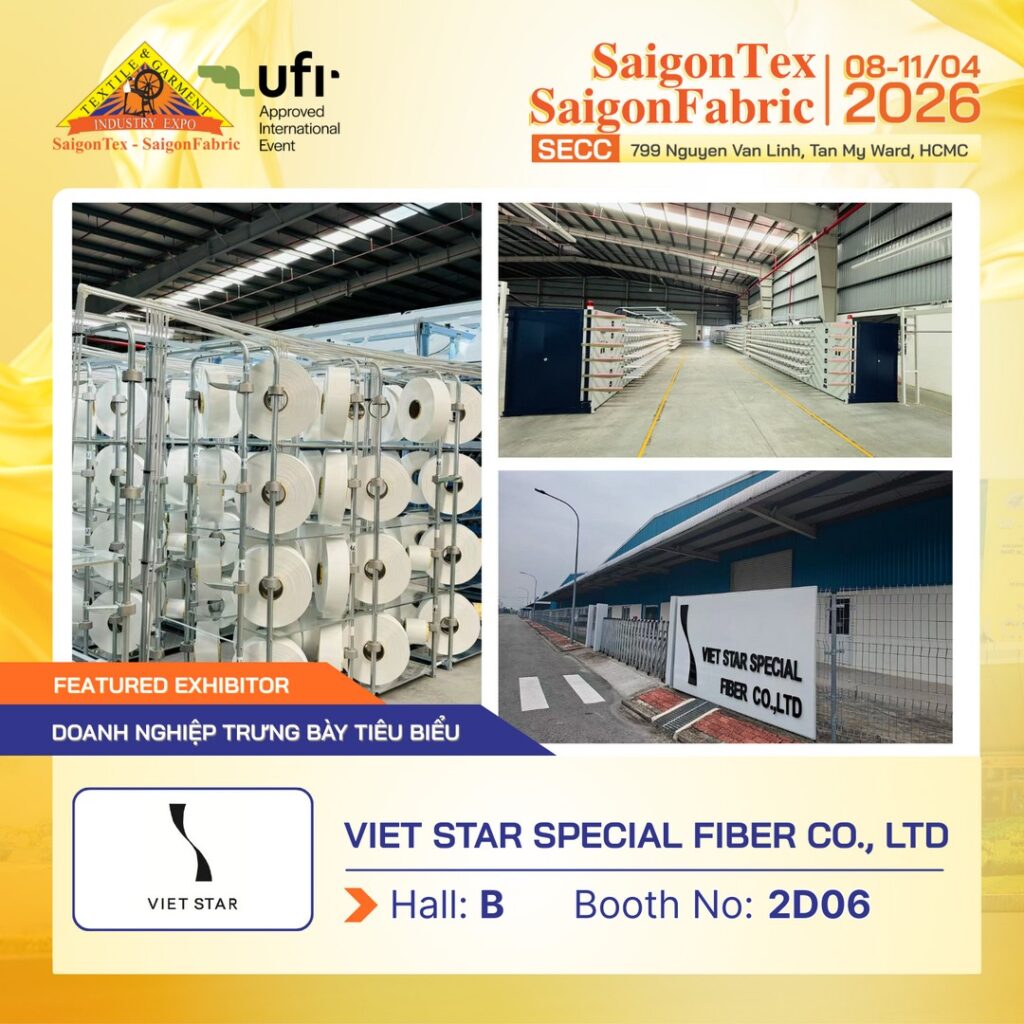 Tại Triển lãm Quốc Tế ngành Công nghiệp Dệt & May, Thiết bị nguyên phụ liệu & vải – SAIGONTEX – SAIGONFABRIC 2026, VIET STAR SPECIAL FIBER CO., LTD giới thiệu các dòng sợi chức năng hiệu suất cao, đáp ứng nhu cầu ngày càng đa dạng của ngành dệt may hiện đại.