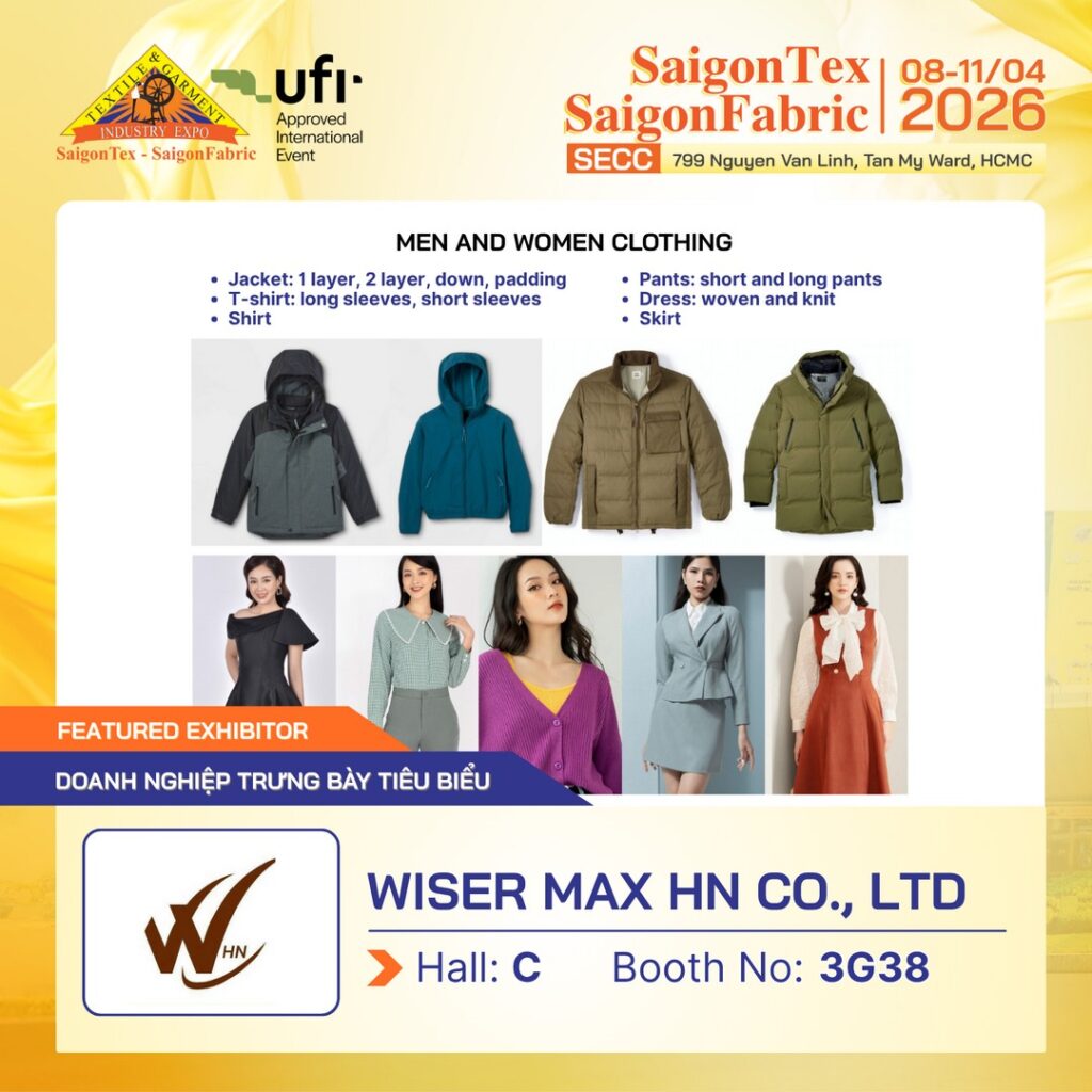 Tại Triển lãm Quốc Tế ngành Công nghiệp Dệt & May, Thiết bị nguyên phụ liệu & vải – SAIGONTEX – SAIGONFABRIC 2026, WISER MAX HN CO., LTD giới thiệu các giải pháp sản xuất và gia công may mặc đa dạng, đáp ứng nhu cầu thị trường toàn cầu.