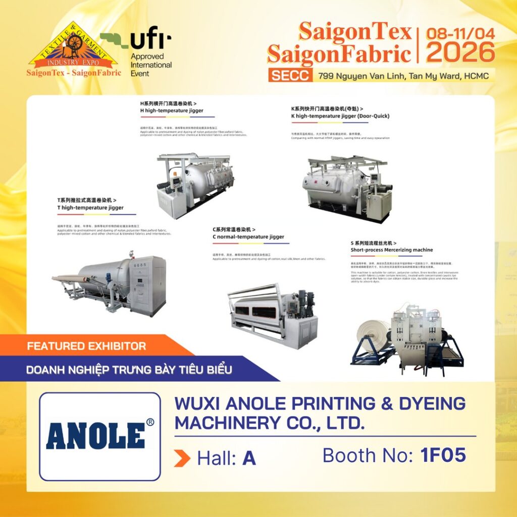 👉 Hãy đăng ký tham quan Triển lãm Dệt May Quốc Tế quy mô hàng đầu – SAIGONTEX – SAIGONFABRIC 2026 để gặp gỡ trực tiếp ANOLE và khám phá các giải pháp nhuộm tiên tiến.