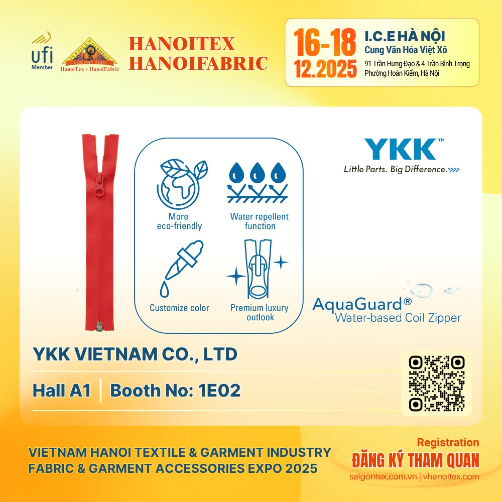 YKK VIET NAM CO., LTD tự hào giới thiệu dòng sản phẩm dây khóa kéo PU cán thế hệ mới AquaGuard® Water-based – giải pháp thân thiện với môi trường được kỳ vọng tạo dấu ấn tại triển lãm HanoiTex & HanoiFabric 2025.