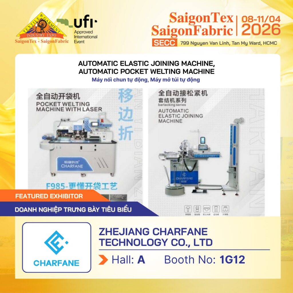 Tại Triển lãm Quốc Tế ngành Công nghiệp Dệt & May, Thiết bị nguyên phụ liệu & vải – SAIGONTEX – SAIGONFABRIC 2026, ZHEJIANG CHARFANE TECHNOLOGY CO., LTD giới thiệu các giải pháp máy may tự động hóa và thiết bị thông minh, giúp tối ưu quy trình sản xuất may mặc.